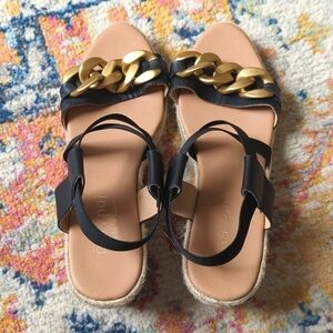 Sold by Anthropologie, these super cute shoes were made in Spain to feature an espadrille trim with a 2.75" wedge, 1" platform, an almond shaped open toe, a leather strap with a chunky gold chain detail, and a strappy wrap around elastic closure at the ankle. They have a rubber covered outsole for light traction. They are black in color with tan colored jute. Very comfortable and easy to walk in! These sandals are modern, relaxed and chic, perfect for all of your warm weather outfits! They are extremely versatile, eye catching, sophisticated, and easy to wear from day to night, pairs great with anything from skirts and dresses to jeans! High quality!