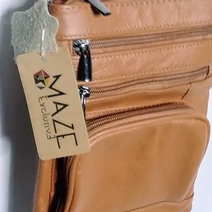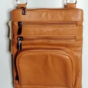 Brown Cross Body purse with Multi Zippers on the top, front and back, has long shoulder strap with adjustable buckle for length. This is a Very Nice Bag. Used-Good Condition.