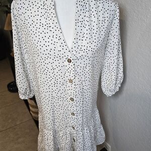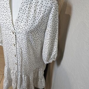 Stylish white dress with black polka dots. Button-up design with long sleeves.