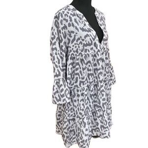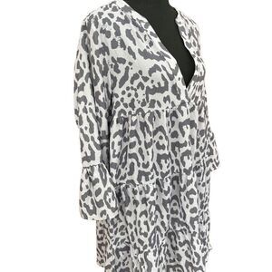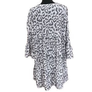 Mazik gray animal print ruffled boho style dress with bell sleeves size M. Split v neckline, long sleeves with bell at bottom. Tiered ruffles, relaxed fit, 100% polyester. Super cute with sandals or boots! Approximate measurements are pit to pit 20”, length from shoulder approximately 35”.