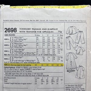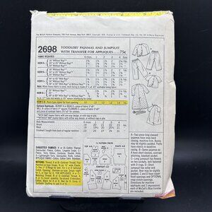 McCall's 2698 “Toddlers Pajamas & Jumpsuit w/ Transfer for Appliques” Sewing Pattern in New Uncut Factory Folded Condition.