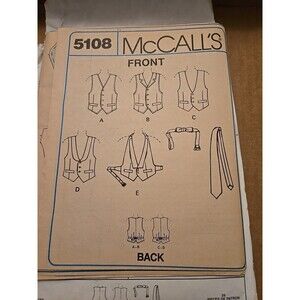 This is a vintage McCall's sewing pattern (5108) for a men's evening vest, neck tie, and bow tie in tall sizes 36-40. The pattern is from 1990 and was manufactured in the United States. It is designed for adult men and is an original piece.