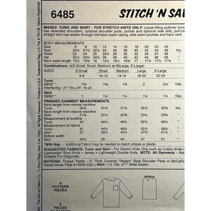 McCalls 6485 Sewing pattern tunic long sleeve pencil skirt size Xs S M