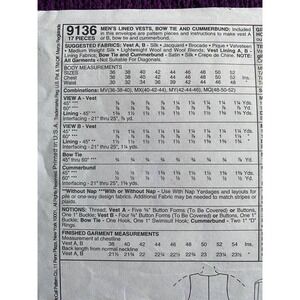McCalls 9136 mens vest bow tie cummerbund pattern size 36 38 40