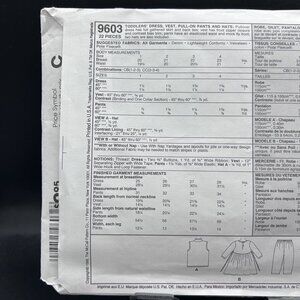 McCall's Cozy Togs 9603 “Toddlers' Dress, Vest, Pull-On Pants & Hat” Sewing Pattern in New Uncut Factory Folded Condition.