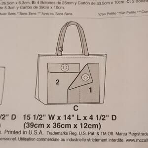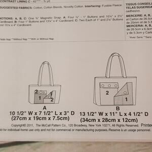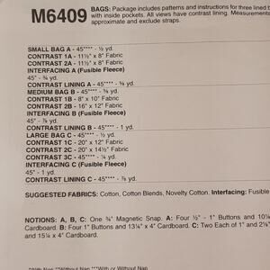McCall's Fashion Accessories M6409 Lined Bags Sewing Pattern. Patterns for lined bags in 3 sizes (See pics for sizes). Factory folded and uncut. Includes instruction pages.