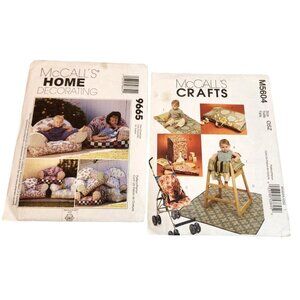 This is a set of two McCall’s sewing patterns: "Home Decorating Pattern 9665" for kid-sized armchairs and "Crafts Pattern M5604" for baby accessories. The armchair pattern includes instructions for creating charming patchwork-style furniture, perfect for children. The baby accessories pattern covers items such as high chair covers, bibs, and stroller liners. Each pattern contains detailed directions and measurements in English, with diagrams for easier assembly. Both patterns offer versatile options for functional and decorative home crafting projects.