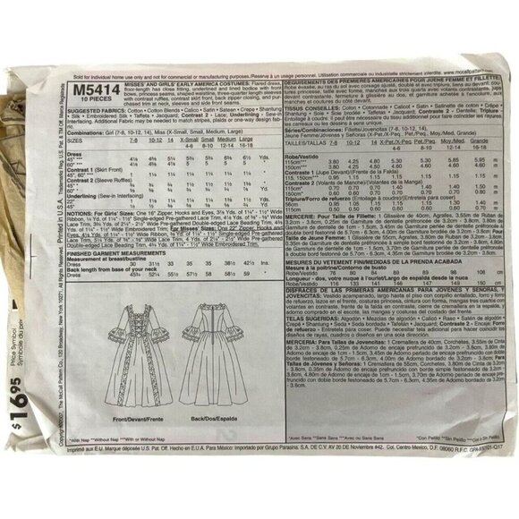 McCalls M5414 Colonial Ball Ren Faire Costume Pattern Sz Miss XS-L CUT