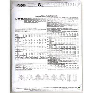 The McCall's M7729 is a sewing pattern perfect for creating stylish button-front jackets and vests. Suitable for women's sizes 14 to 22.