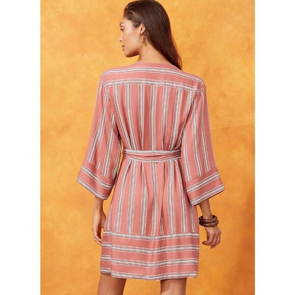 This sewing pattern offers versatile options for crafting stylish tops and dresses, complete with button-front designs, adjustable belts, and various sleeve styles.