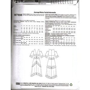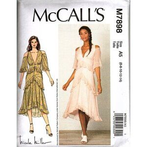 This Nicole Miller design from McCall's offers a sewing pattern for creating elegant, flowy dresses with a cold-shoulder style and ruffled details. Designed for misses in sizes 6-14, the pattern suggests crepe or chiffon for a refined and graceful finish. A charming addition to any wardrobe creation.