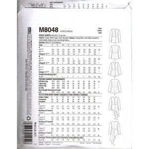 This McCall's M8048 pattern is an exquisite guide for crafting elegant jackets designed for the discerning fashion enthusiast. With options for various styles and fits, it empowers the seamstress to create three distinct jacket designs. Accompanied by comprehensive instructions, it promises a rewarding sewing experience for both novice and seasoned artisans.