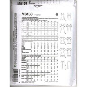 This McCall's M8158 sewing pattern is uncut and features designs for a women's top, dress, and Capri pants, tailored for sizes 18W to 24W.