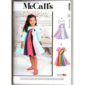 McCall's M8267 is a sewing pattern for girls' knit dresses, sizes 2T to 6. It features three unique styles and is uncut and new.