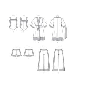 Easy to Sew Misses' Bodysuit, Robe, Shorts and Pants. Knit bodysuit has wide straps, contrast side panels and snap tape closure. Robe has kimono style sleeves, belt, thread loops and side seam pockets. Pull-on shorts and pants have elasticized waist, contrast side panels and bands. Pants have side seam slits at the leg.