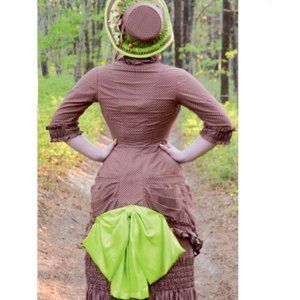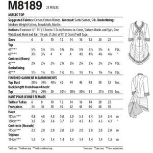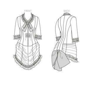 McCalls pretty top pattern M8189. This afternoon visiting or walking ensemble is worn while paying calls on friends & neighbors. It should be made of practical fabrics in shades of navy, brown or dark green to conceal dust, soot or mud. The self-fabric ruched trim is at the collar, elbows & hemline. Bows of contrast fabric are at the neckline & back. The top has formfitting seams, opens down the front & is underlined with cotton.