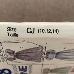 Used 1996. Great condition. 8 looks in one pattern. Size CJ (10, 12, 14). Children’s and girl’s dresses and veils. Dress with neckline and sleeve variations has fitted bodice, full gathered skirt and back zipper closure; belts and instructions for veils also included.
