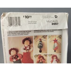 The McCalls Sewing Pattern #8997 is a vintage craft pattern from 1997 that allows you to create Raggedy Ann & Andy Christmas decorations.