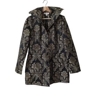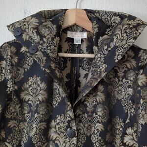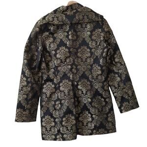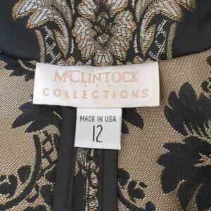 McClintock collection made in USA size 12 women's jacket long line metallic gold silver black dress coats absolutely gorgeous stunning print polyester button down extravagant neckline towel neck tunnel neck funnel neck long sleeve dressy elegance coats perfect for any events length 32 flat across under arm 20 excellent pre-owned condition has pockets!!