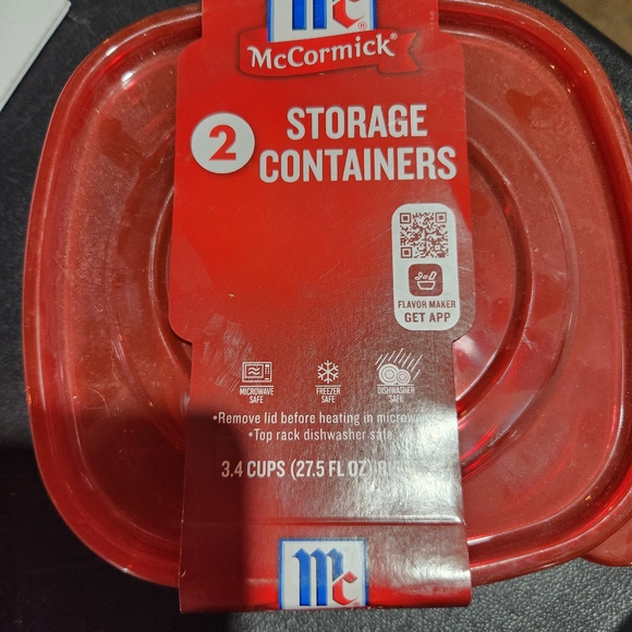 Keep your food fresh with McCormick's red storage containers. Perfect for organizing your kitchen.
