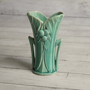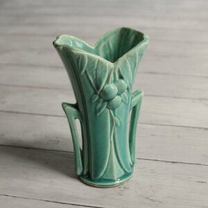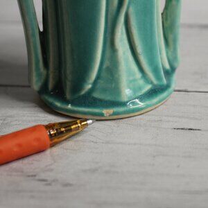 This vase is a beautiful shade of vintage blue with a slight touch of green. It is in lovely condition however please know there is a small chip in the glaze near the bottom edge. It's nice quality and such a beautiful vase.
