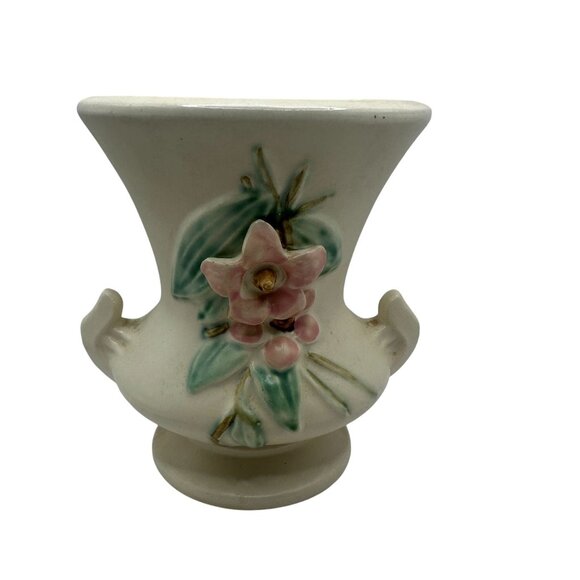 This vintage ceramic vase features an elegant ivory finish with a raised pink floral design. Its dual handles and classic shape add timeless sophistication.