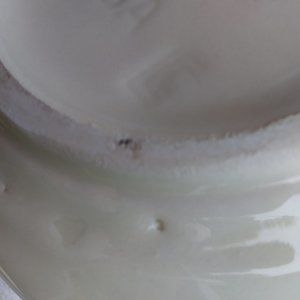 McCoy Vintage Apple Goose Berry Brown cream/tan 7515 scrolled handle Pitcher. Soda can in pic to help with size visualization . Nice fall decor piece . There are some manufacture's errors see last 4 pics ... like a air bubble on bottom of pitcher, some other air bubbles and dimples on the piece as well as some color on the tan/beige part see very last pic all under the glaze . Cool scroll deign on handle where your thumb would hold onto the pitcher to pour... country, farm decor