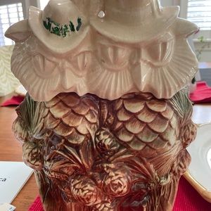 This is a collectible McCoy owl pair cookie jar. It has its title listed on the back as shown. Paint erosion on owls but in overall excellent condition.