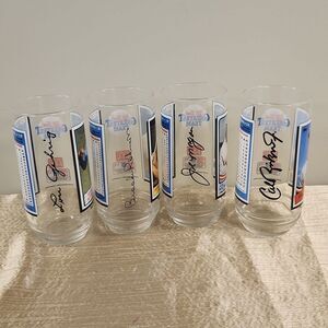 This is a set of 4 McDonalds All Time Greatest Team 1993 Basball Glasses. Set includes Cal Ripken, Joe Morgan, Brooks Robinson, Lou Gehrig. The glasses graphics is the players Topps card with their picture on the front and their stats on the back.