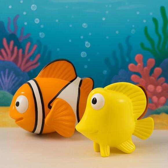 Dive into a sea of early-2000s charm with this cheeky little clownfish from the 2003 McDonald’s Happy Meal lineup! Though he’s silent as the deep blue, his personality is anything but quiet. Inspired by Disney/Pixar’s Finding Nemo, this collectible cutie was part of the splashy promo wave that had kids everywhere swimming to McDonald's. Made in China and recommended for ages 4+, he’s perfect for collectors, nostalgic souls, or anyone who believes fish are friends and fabulous shelf décor. No sound, no fuss—just pure aquatic attitude.