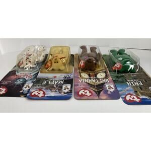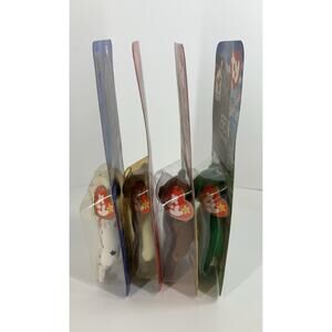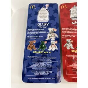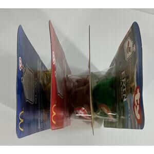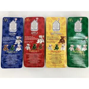 1999 McDonald’s Happy Meal Teenie Beanie Babies International Bear Bundle includes Glory, Maple, Britannia, and Erin. All are new in package but contain wear and bends on the cardboard. Plastic contains dents and has some yellowing. Yellowing on plastic is heavy on Maple. Please see pics for condition issues on all items.