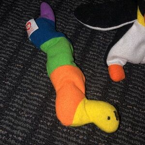 Set of colorful beanie babies including a penguin, flamingo, lobster, bull and caterpillar. Perfect for playtime.