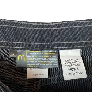 McDonalds uniform black jean style pants in women’s size 2. Zipper and button closure. Four pockets. Adjustable length with hook and loop closure inside the leg. 70% cotton 29% polyester 1% elastane. Machine washable. Style MC276 Straight leg. Like new!