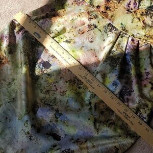 McGinn Knightsbridge "Cooling Magma" strapless print cocktail dress from Anthropologie in excellent used condition. Abstract green, gold brown, and lavender print is suggestive of a floral. Zippered back with hook and eye closure, rubberized at neckline for secure grip. Pleated for extra room at the hips, and has pockets on the seams. Dress is fully lined.
