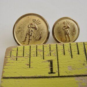 Gold tone metal button set features the iconic bagpiper design. Shank back. Two front buttons, six cuff.