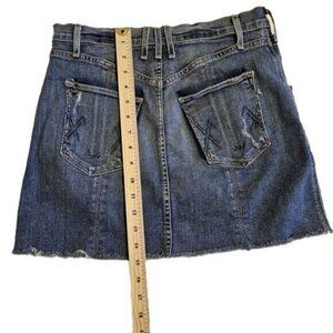 McGuire Made in USA womens mini medium wash blue denim skirt with raw/frayed hem.