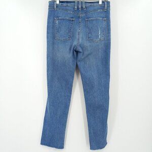 McGuire Vintage Slim Jeans In Vroom Vroom Women’s Distressed Ripped High Waisted Medium Wash Exposed Zipper Cropped Asymmetric Raw Hem Stretch Boho Festival.