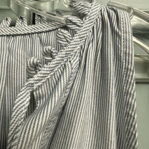 Blue and white tiny stripe with a soft fabric, loos fit tank style with a v-neckline and tie detail