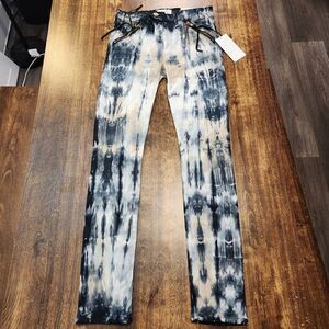 McGuire Margot Tassel Slim jeans in Babouche Tie Dye. Has a zipper design next to the zipper on left pocket from the dying process. Tan, blue, and white. 91.5% cotton, 6% PES, 2.5% lycra. Size women's 25".