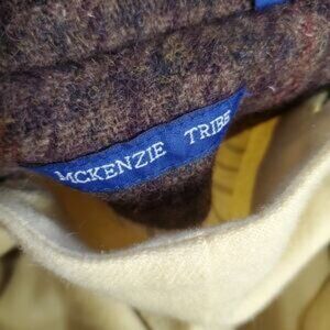McKenzie Tribe USA Men's Size Large Wool Button Leather Trim Long Coat. There is some wear. 24 inches armpit to armpit. 51 inches long
