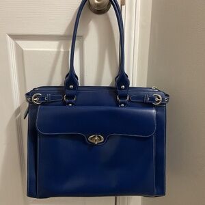 McKlein Laptop Briefcase. Gorgeous Navy blue top grain cowhide leather. Front closing pocket to conveniently store frequently accessed items. Built-in business organizer for pens, business cards and small essentials. Interior zipper pocket. Tablet pocket. Built-in padded laptop compartment to accommodate up to a 15” laptop. Interior dividing zipper pocket helps separate important documents and belongings. Back smart strap easily attaches to rolling luggage for effortless travel. Single top zipper closure ensures secure storage. 16.5” x 4” x 12.5”