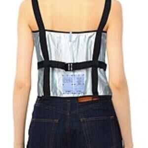techno fabric, laminated effect, brand logo, two-tone, square neckline, sleeveless, no pockets Moon sun stars celestial gypsy zodiac bohemian editorial bustier Emo, punk, scene, goth,glam, rock, grunge, edgy, alternative silver metallic corset bustier Festival, concert, rave, music, indie, Coachella, Lollapalooza, VSCO, edgy,