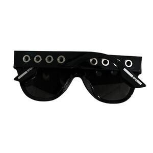 Details: Silver mirrored lenses. Black plastic frames in a cat eye style. Edgy, silver hardware details on the sides of sunglasses. 54mm wide lenses and 144mm wide.