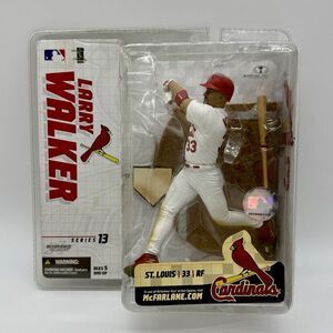 The product is a McFarlane Sports Picks MLB Series 13 Larry Walker action figure, manufactured in 2005 by McFarlane Toys. This vintage collectible features Larry Walker from the St. Louis Cardinals franchise, with a baseball theme and accessory type of a baseball bat. The figure is original and comes in its original packaging, making it a sought-after item for baseball fans and collectors alike. Made of plastic and representing the MLB era of 2002-Now, this Larry Walker action figure is a must-have for fans of the sport.