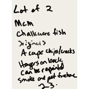 This pair of handcrafted chalkware fish wall hangings adds a touch of coastal charm to any space. The distressed finish gives them a rustic, authentic look, making them versatile decorations for various settings, from beach houses to nautical-themed rooms. Each fish is suspended with a sturdy ribbon for easy hanging.