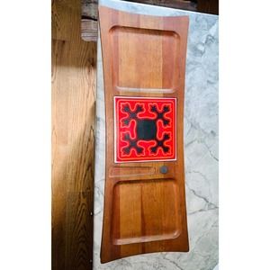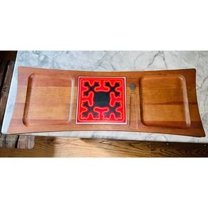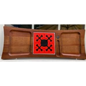 Fun midcentury modern serving snack tray featuring a striking contrast of dark hand carved wood and a bright tribal design tile centerpiece in red and black. 22x7.5”. Excellent vintage condition.