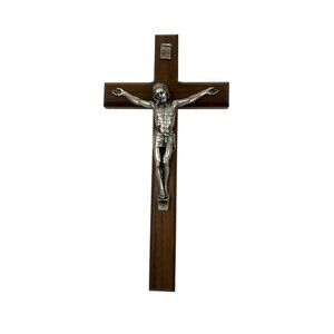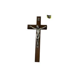 Mcvan Walnut Wood Wall Crucifix Cross 10" Beveled Edges Silvertone Corpus USA