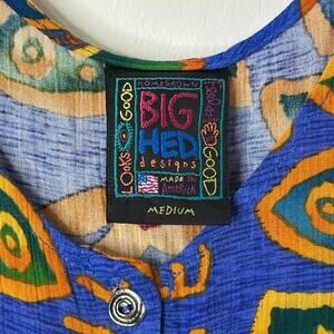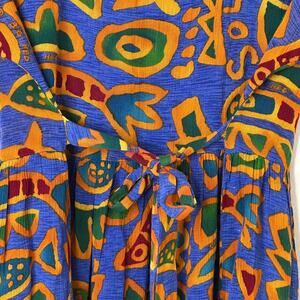Turn heads in this rare 1990s Y2K vintage Big Hed Designs dress — a bold statement piece bursting with personality and nostalgic charm. This eye-catching dress features a vibrant abstract print in shades of orange, green, yellow, & red on a cobalt blue base, with playful tribal & fish motifs throughout. The button-down front & adjustable back tie create a flattering silhouette, while the short sleeves & scoop neckline add to the relaxed vintage vibe.