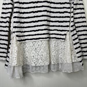 Add a touch of bohemian elegance to your wardrobe with this Anthropologie Postage Stamp cardigan in size medium. Designed with black & cream stripes, this cardigan features a unique sheer chiffon hemline with delicate lace, creating a layered, romantic look that transitions effortlessly from day to night.
