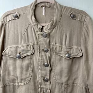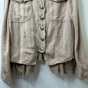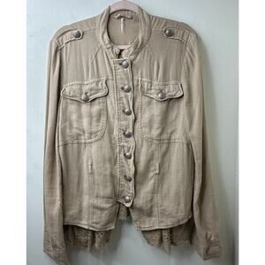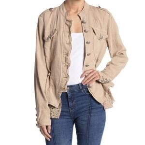 Md Free People Emilia Military Jacket Khaki Linen Blend Lace Ruffle Boho Utility